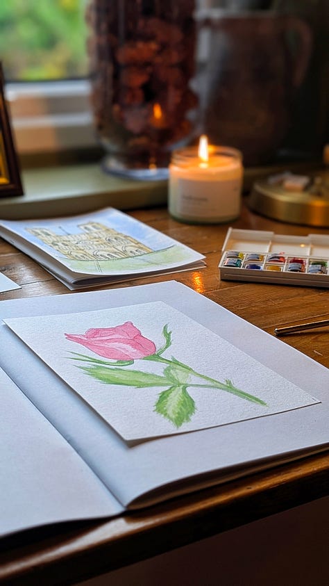 As I write, I’m looking out through my study window at the bare branches of the rose bush and the acer, each holding a few glistening raindrops. They sit there like small jewels, unhurried. The sky is a soft, even grey. Not the wild temper of a storm, more a quiet invitation to stay indoors and slow the day a little.